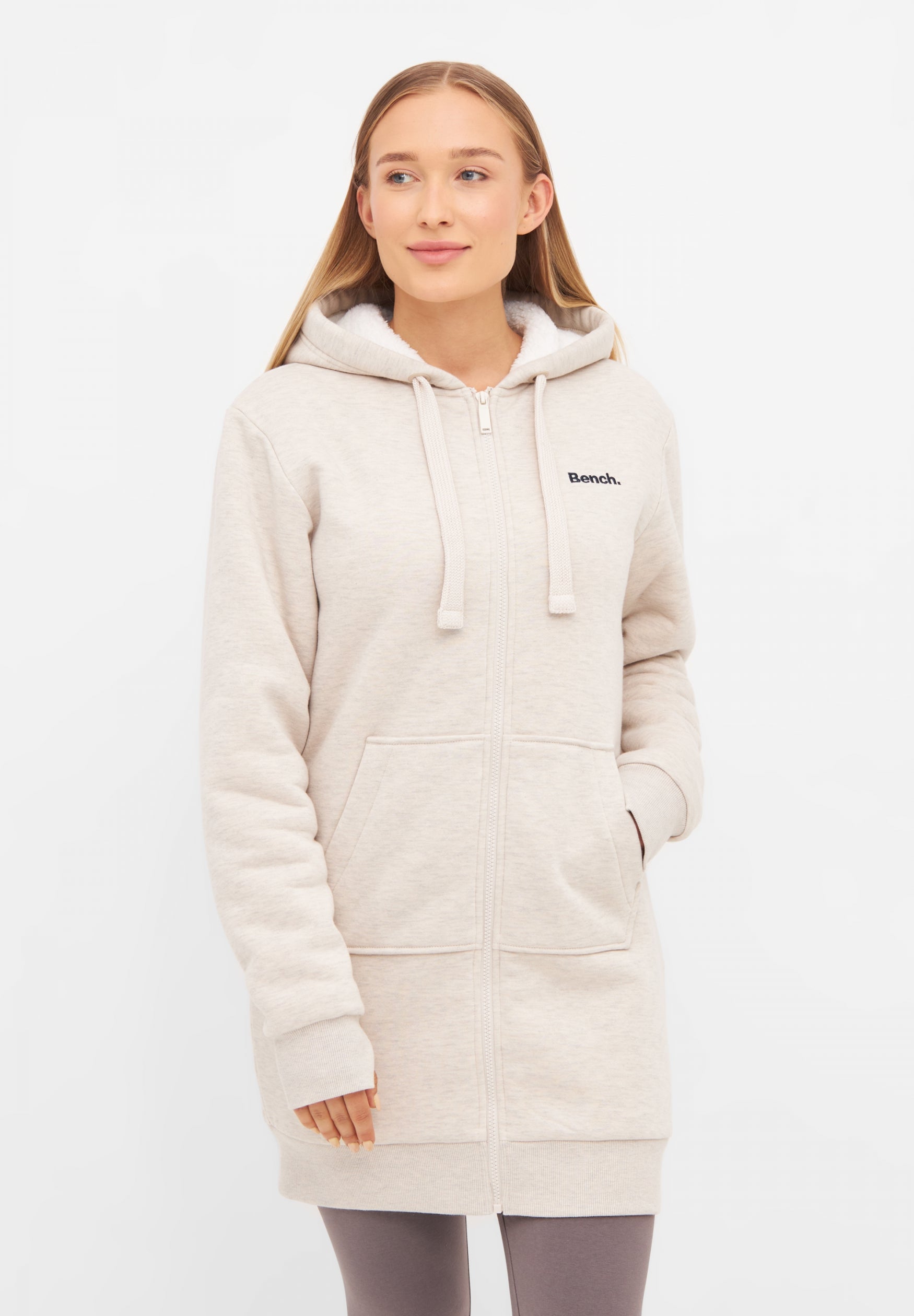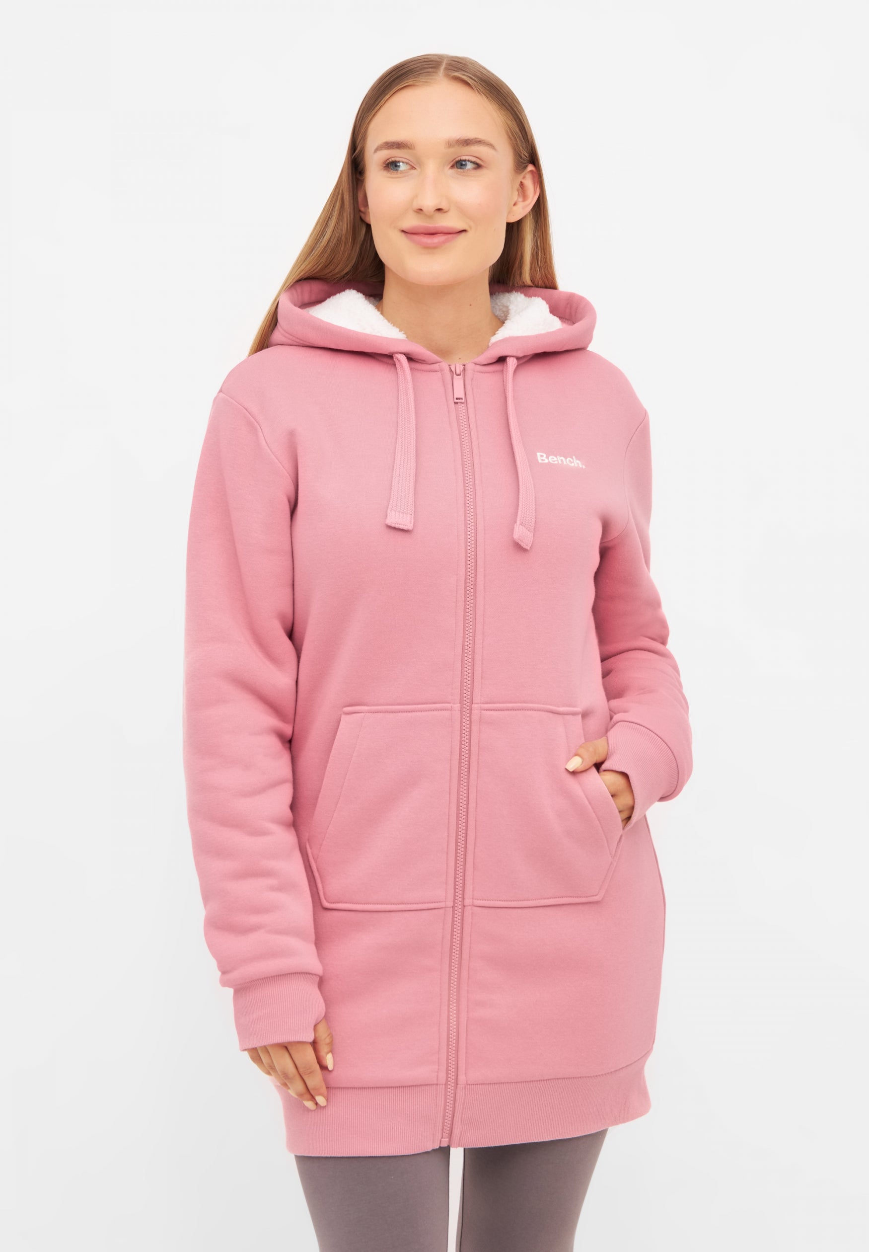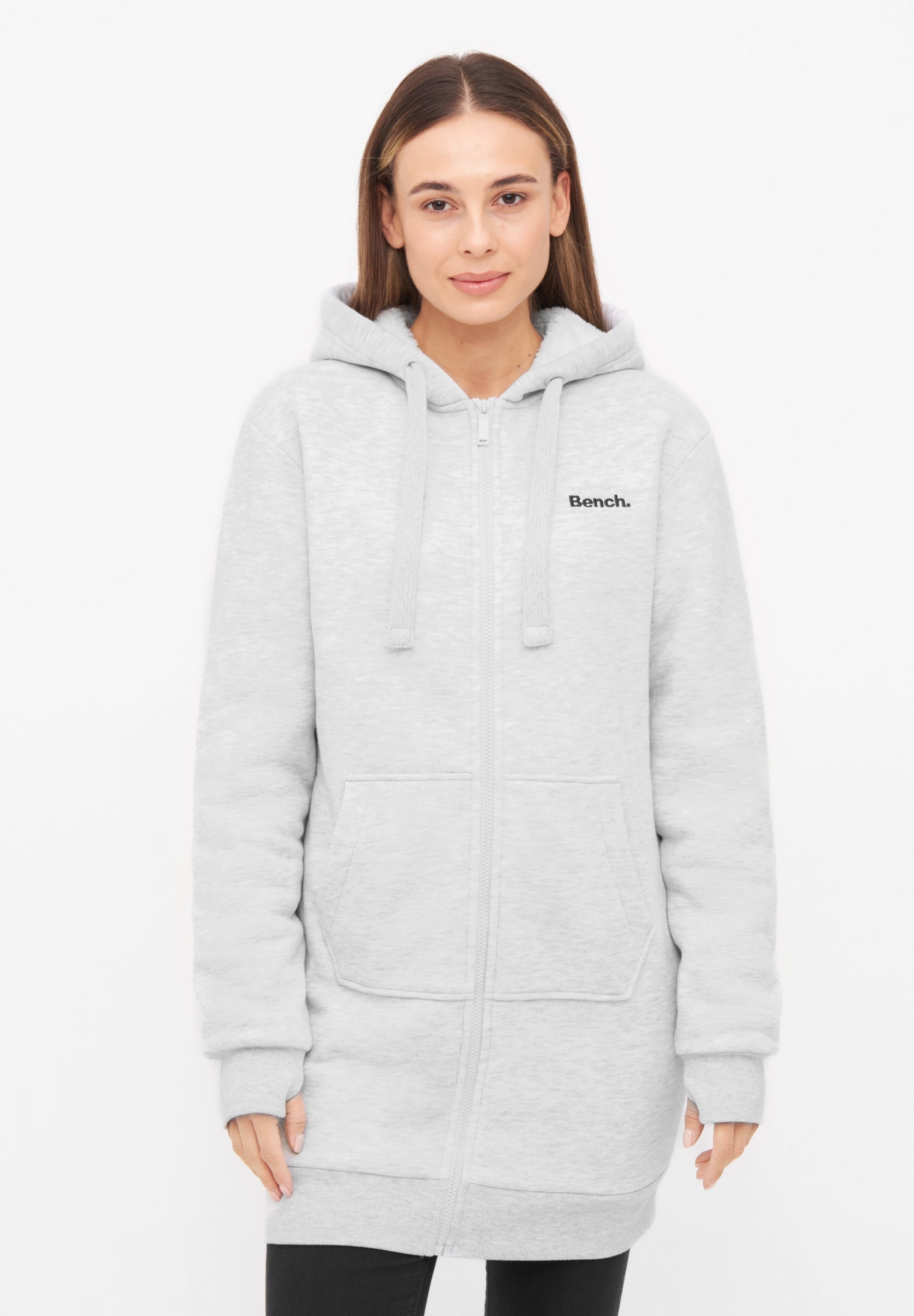 Entdecke die lange Bench Kapuzenjacke für Damen – dein perfekter Begleiter für kühlere Tage! Diese stylische Jacke überzeugt nicht nur mit ihrem lässigen, geraden Schnitt, sondern auch mit einem hohen Tragekomfort. Sowohl die Jacke als auch die Kapuze sind innen weich gefüttert, sodass du auch bei niedrigeren Temperaturen angenehm warm bleibst.