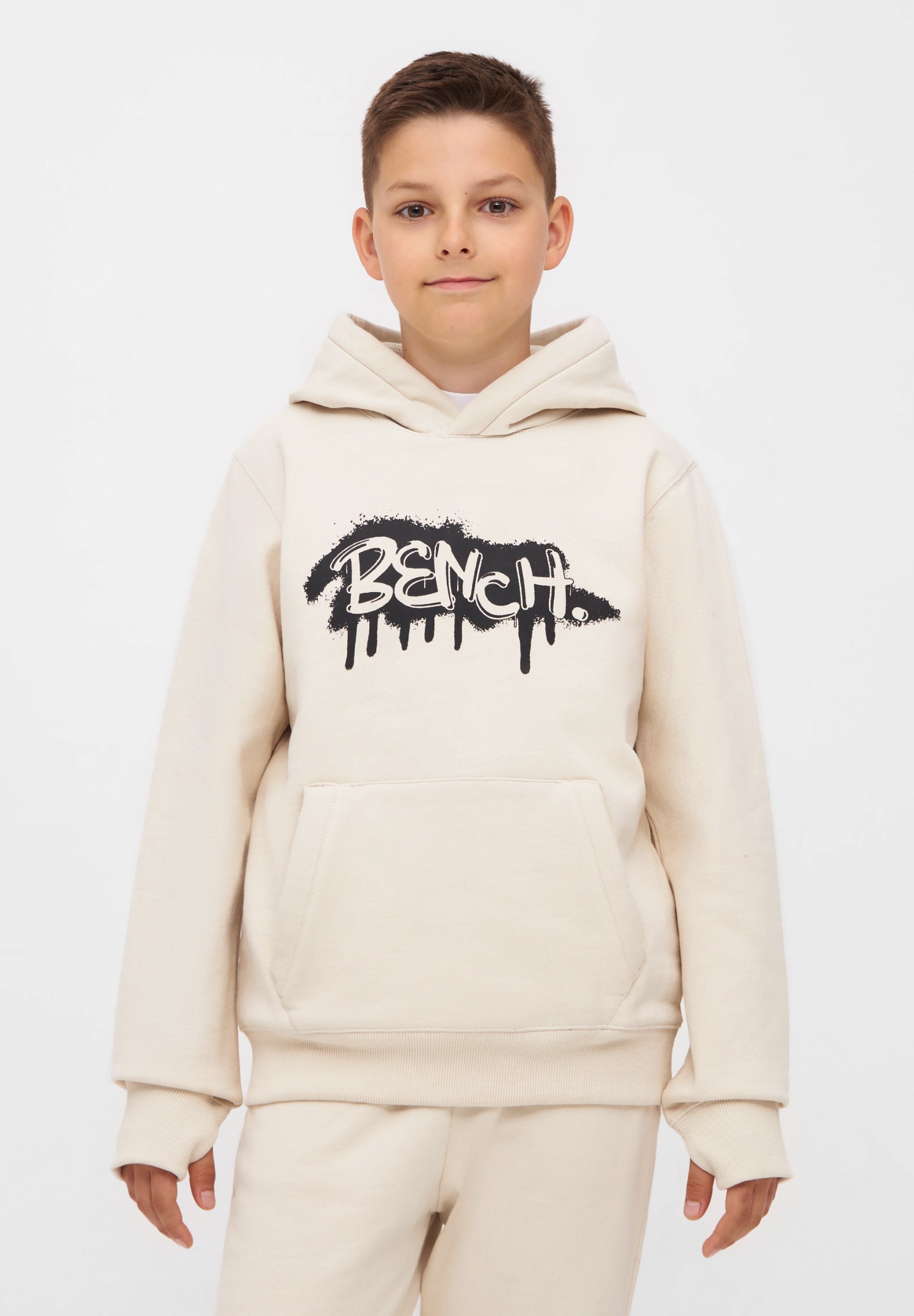 Der Bench Kapuzenpullover für Jungen ist ein stylisches und bequemes Must-have für aktive Kids. Auf der Brust prangt ein cooles Graffiti-Logo, das dem Pullover einen trendigen Streetwear-Look verleiht. Die praktische Kängurutasche bietet Platz für kleine Gegenstände oder sorgt für warme Hände an kühlen Tagen.