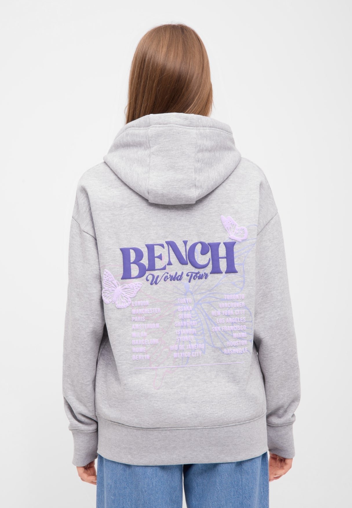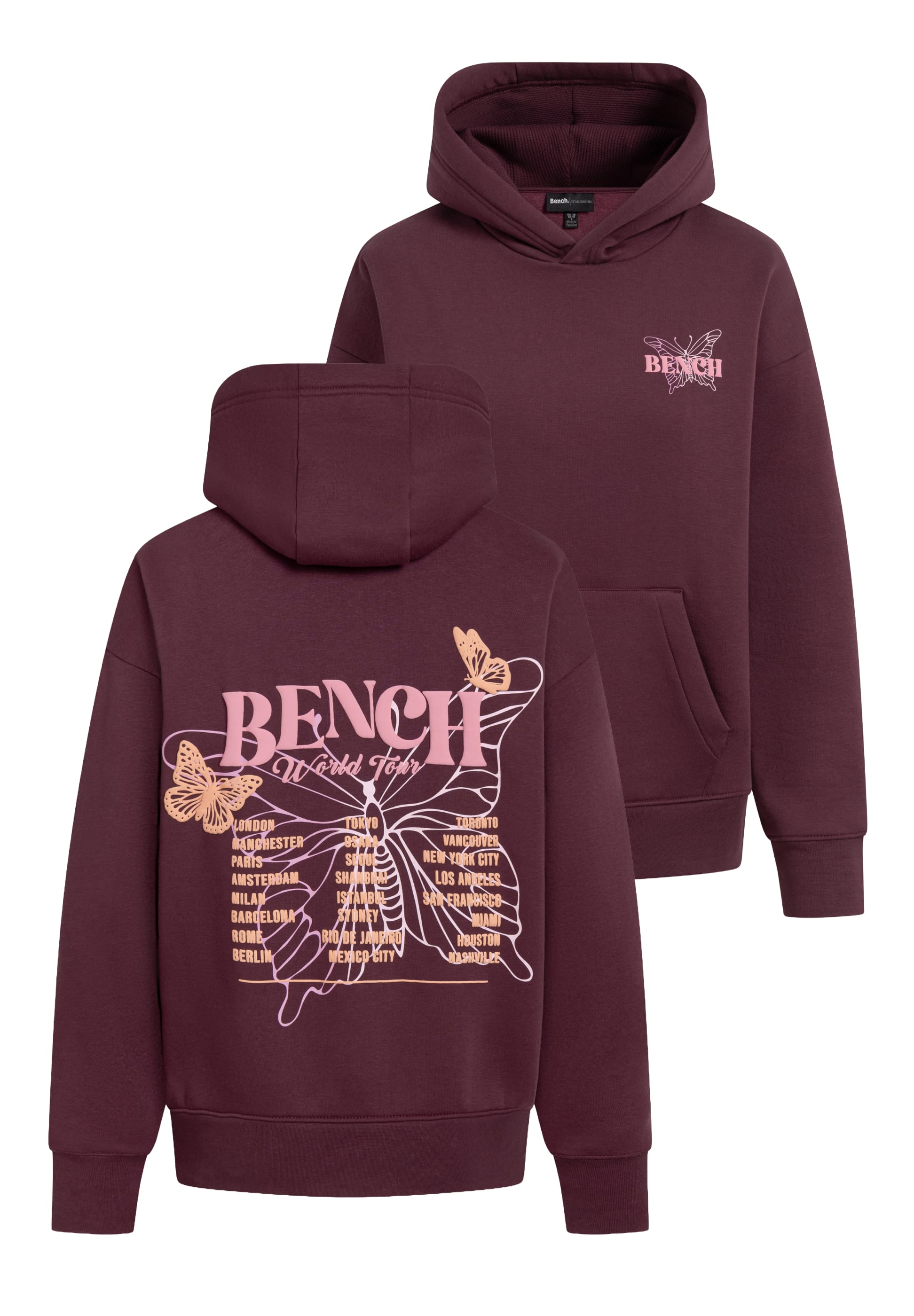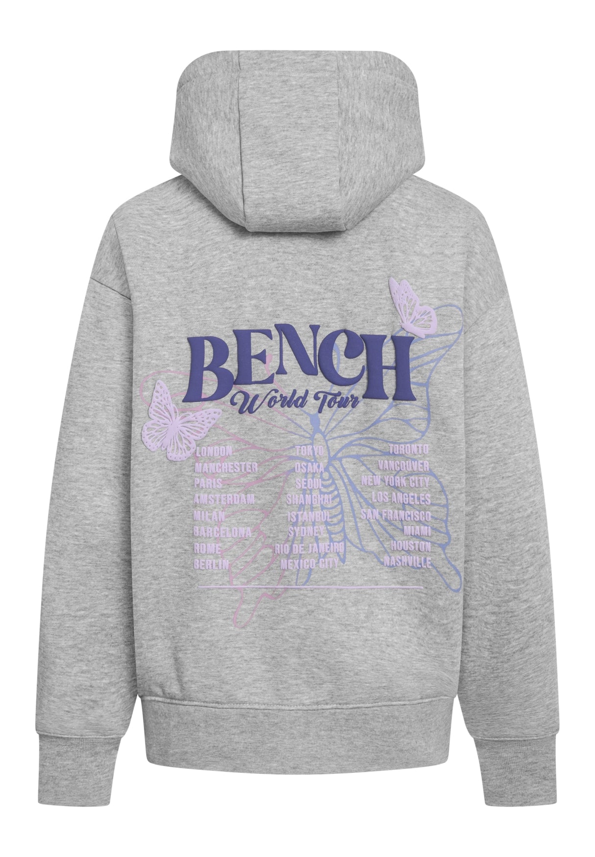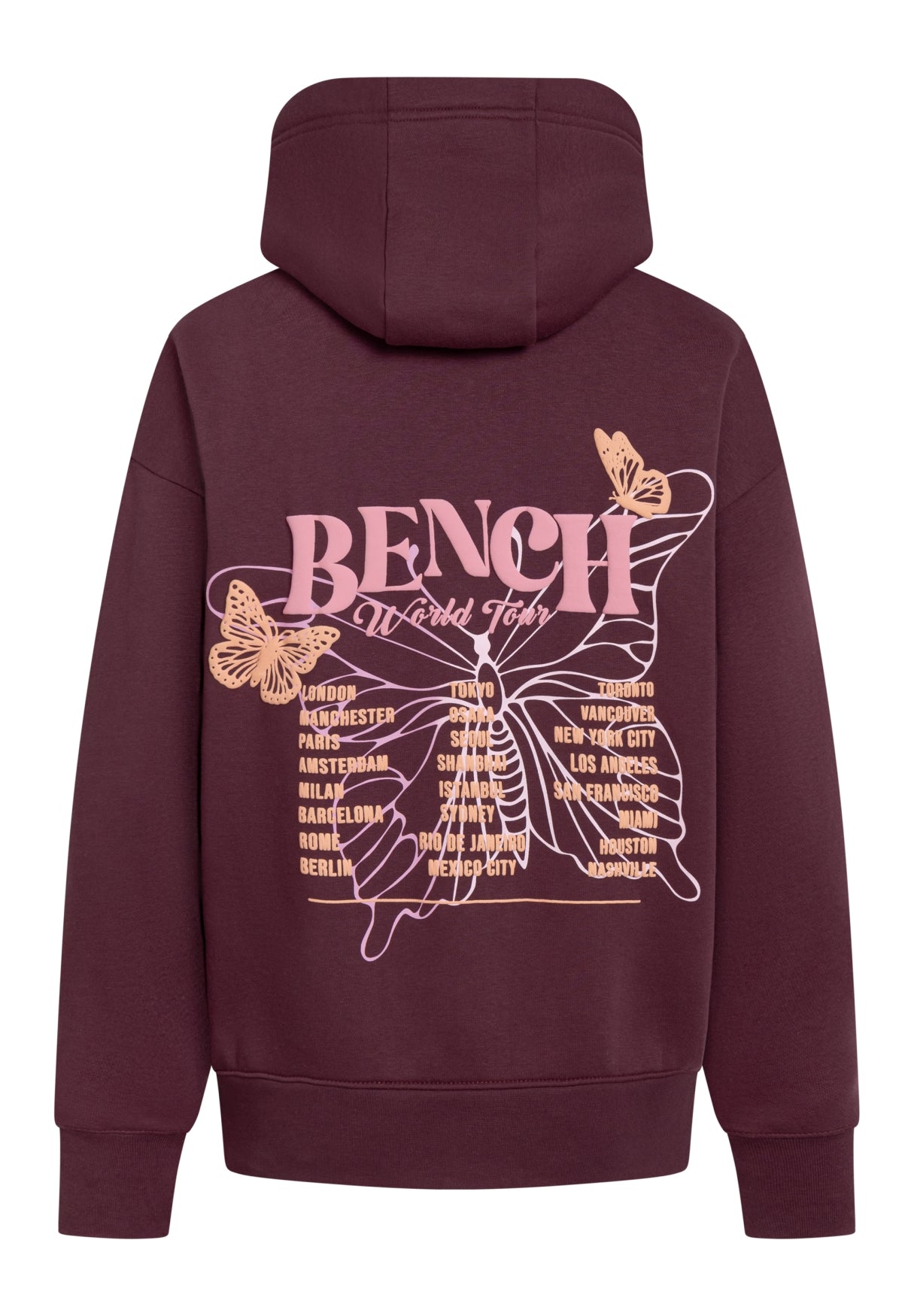 Der Bench Hoodie "Warly" vereint lässigen Streetstyle mit einem Hauch Fernweh. Die Rückseite ziert ein auffälliger Schmetterlingsprint in zarten Pastelltönen, verziert mit den Namen weltberühmter Metropolen – von London bis Tokyo. Zwei filigrane Schmetterlinge und der Schriftzug Bench World Tour runden das Design ab und machen den Hoodie zu einem echten Hingucker.