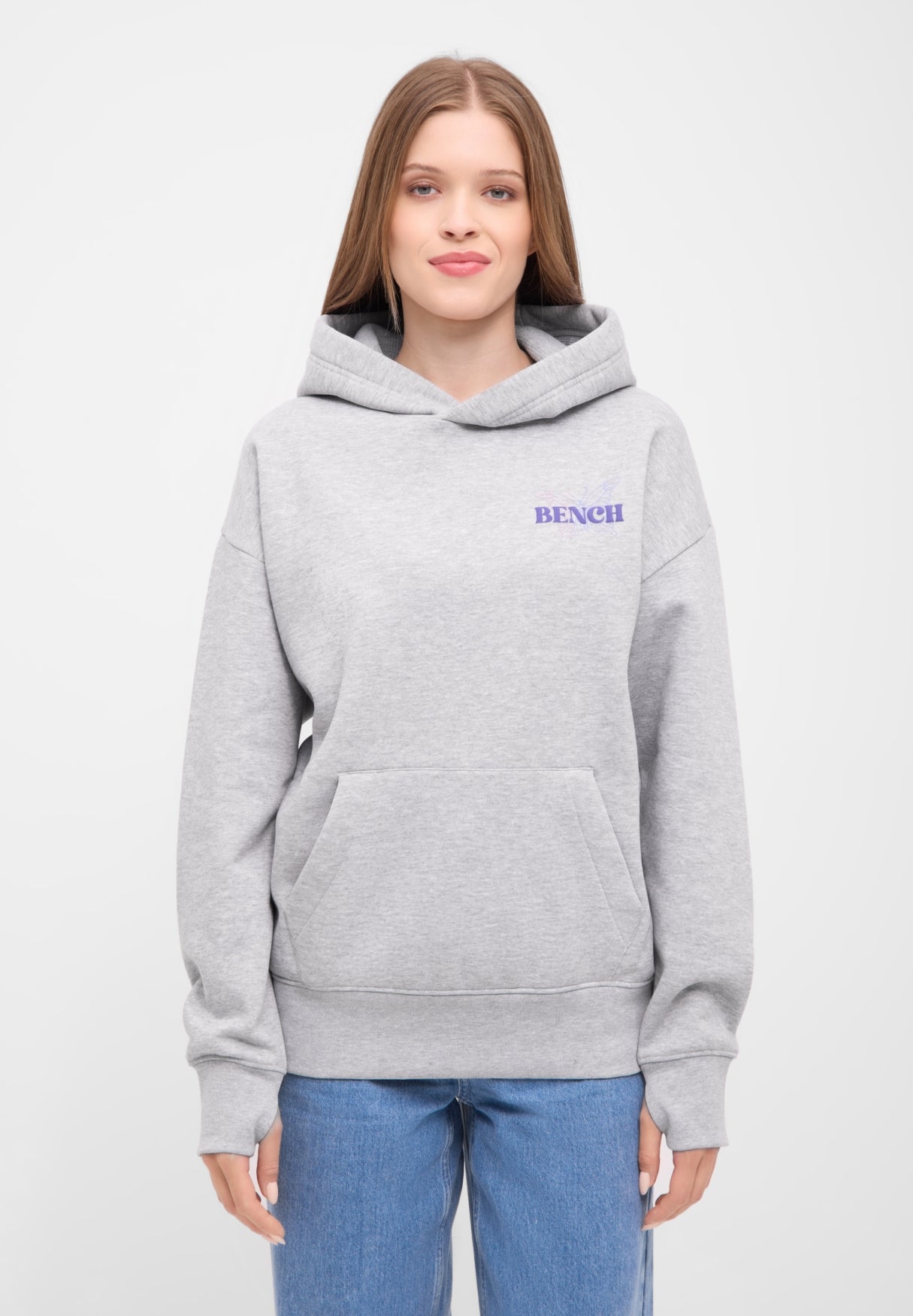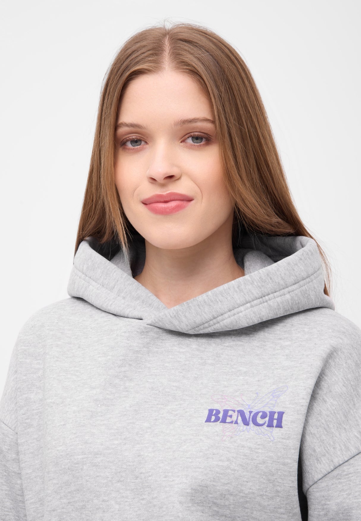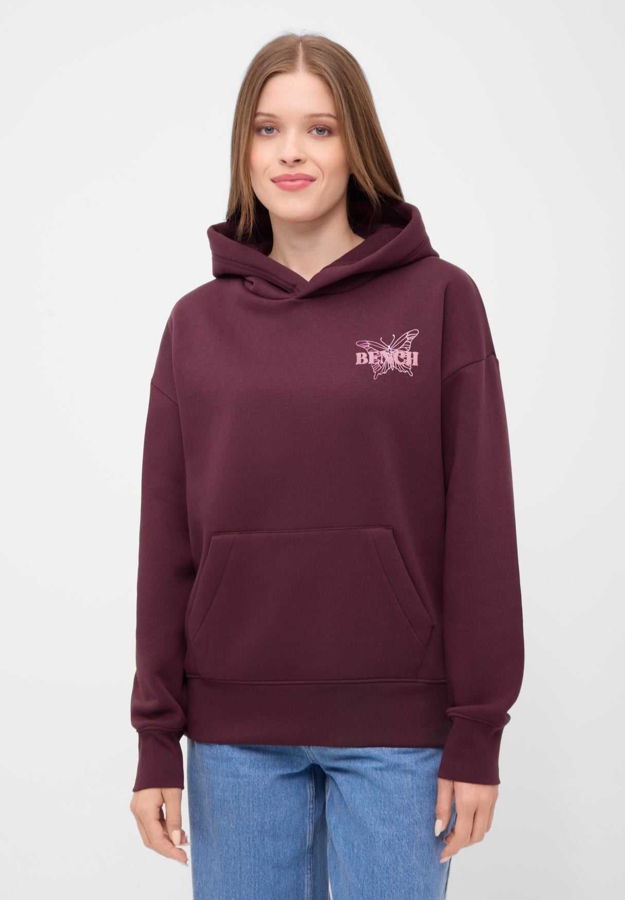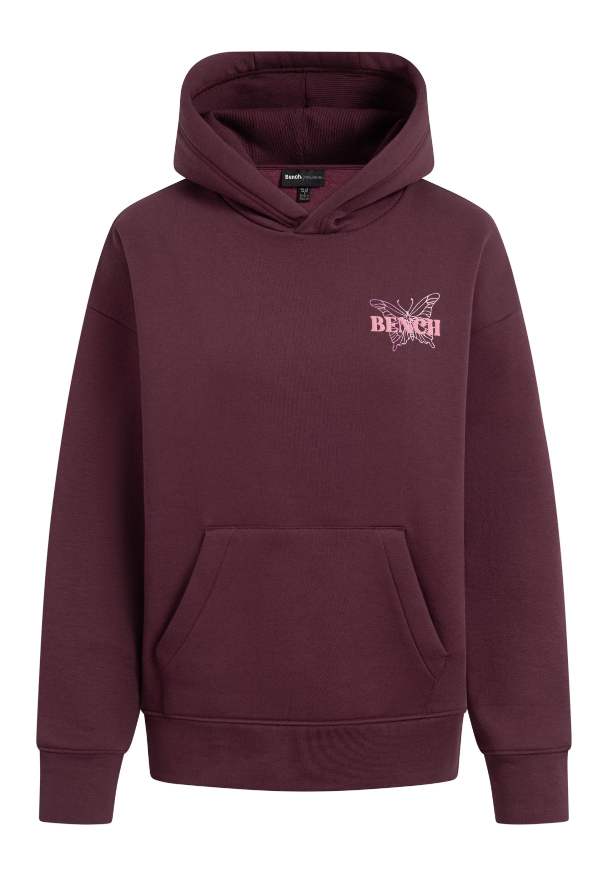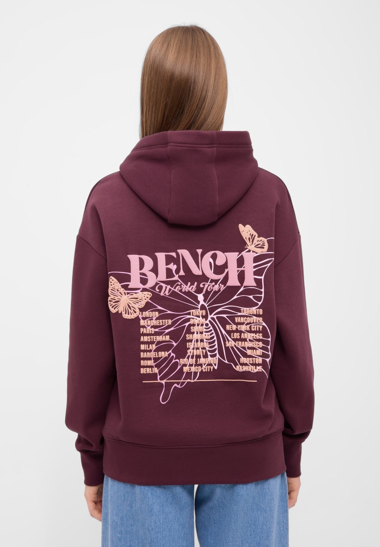 Der Bench Hoodie "Warly" vereint lässigen Streetstyle mit einem Hauch Fernweh. Die Rückseite ziert ein auffälliger Schmetterlingsprint in zarten Pastelltönen, verziert mit den Namen weltberühmter Metropolen – von London bis Tokyo. Zwei filigrane Schmetterlinge und der Schriftzug Bench World Tour runden das Design ab und machen den Hoodie zu einem echten Hingucker.